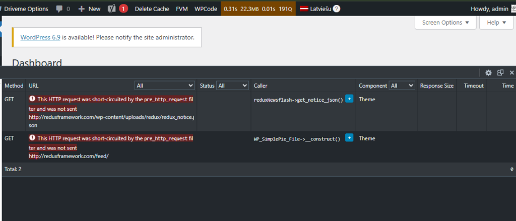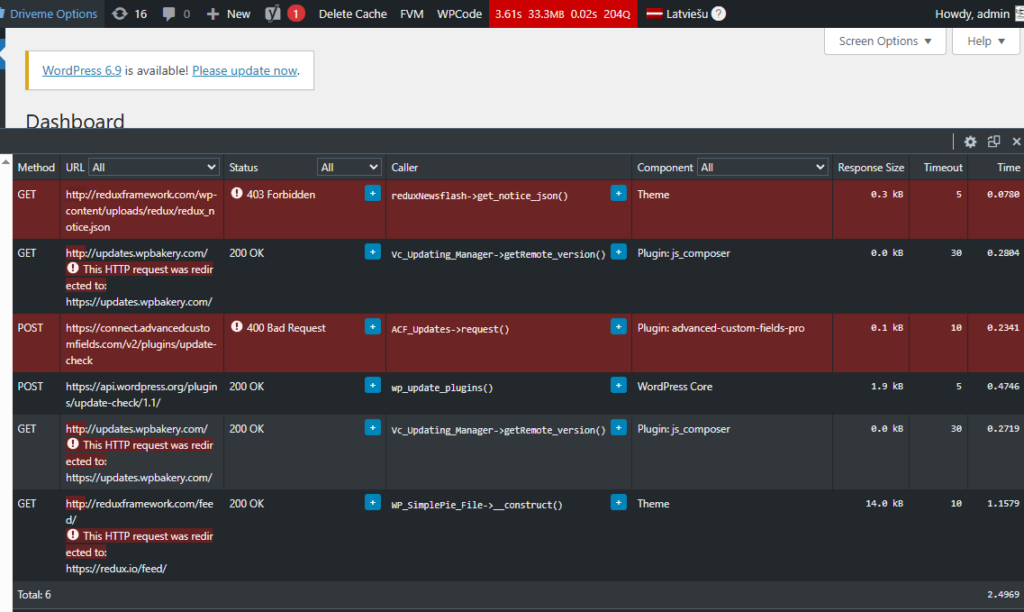 With Query Monitor enabled, here you can see that WordPress admin dashboard has loaded in 3.61 seconds (!!!) from which 2.50 seconds took the outgoing requests from WordPress, installed plugins and theme – all together mainly just to check on the updates.