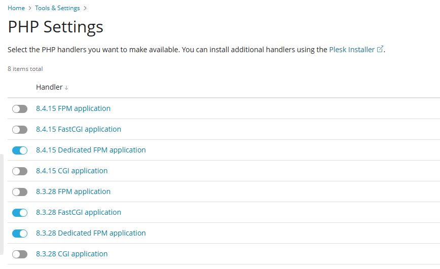 Now you should see a list of PHP handlers. Ensure that the ones you do not use are in a disabled state.